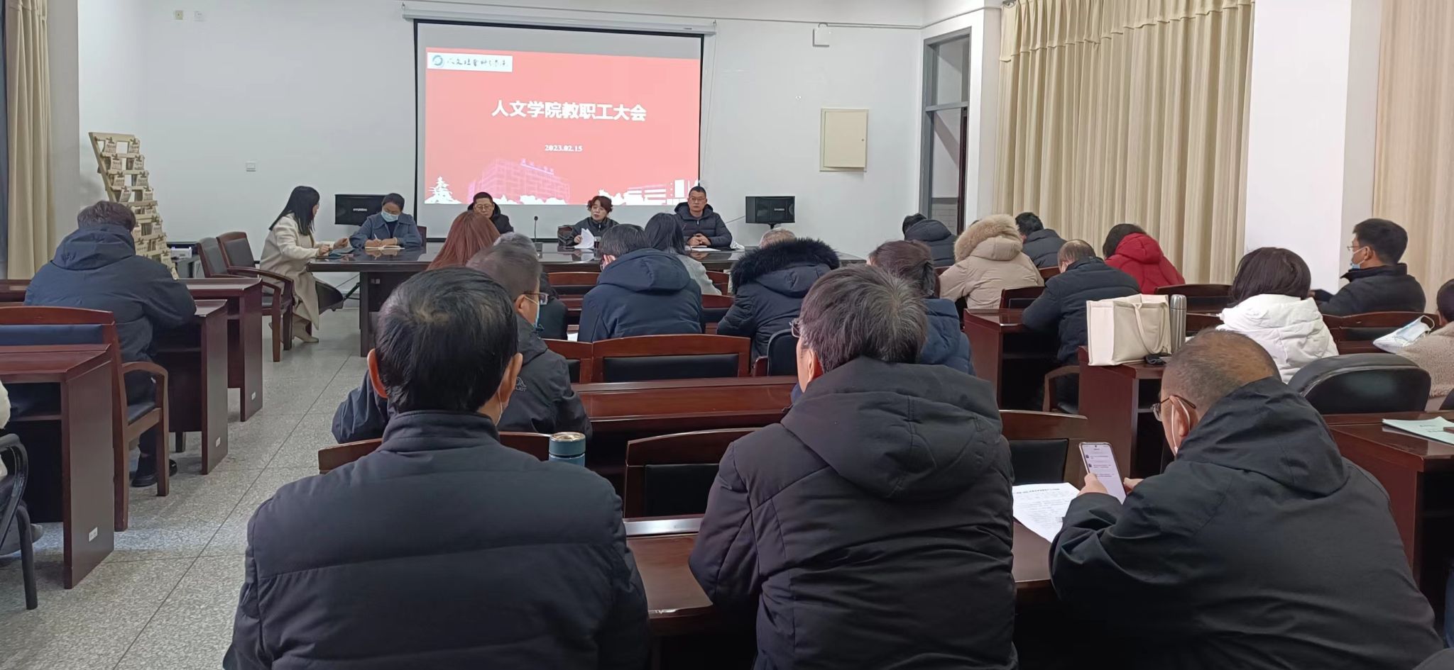 2月15日下午,在仁和楼A304会议室,公司召开春学期第一次教职工大会,回顾总结2022年工作,安排部署2023年重点工作任务。会议由公司经理周晓燕主持,全体教职工参加。