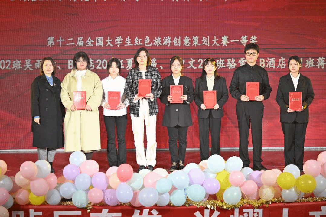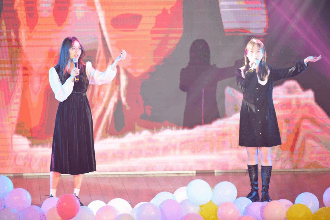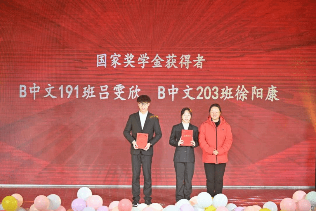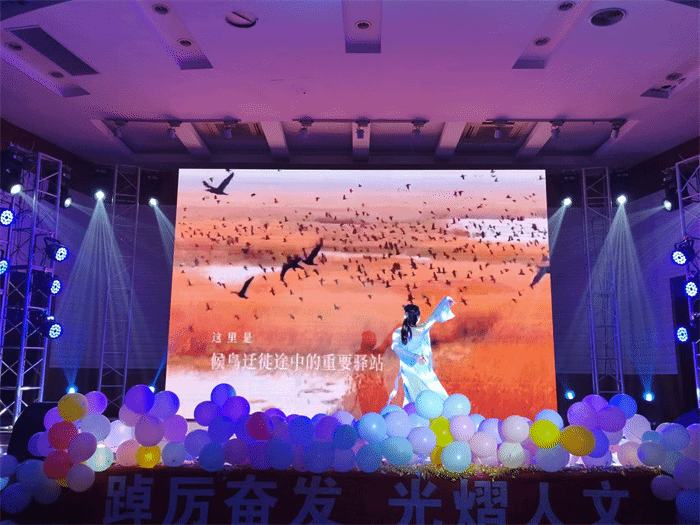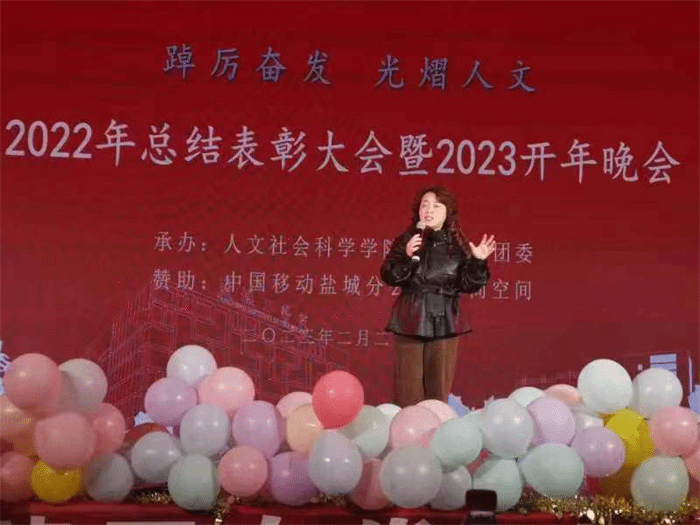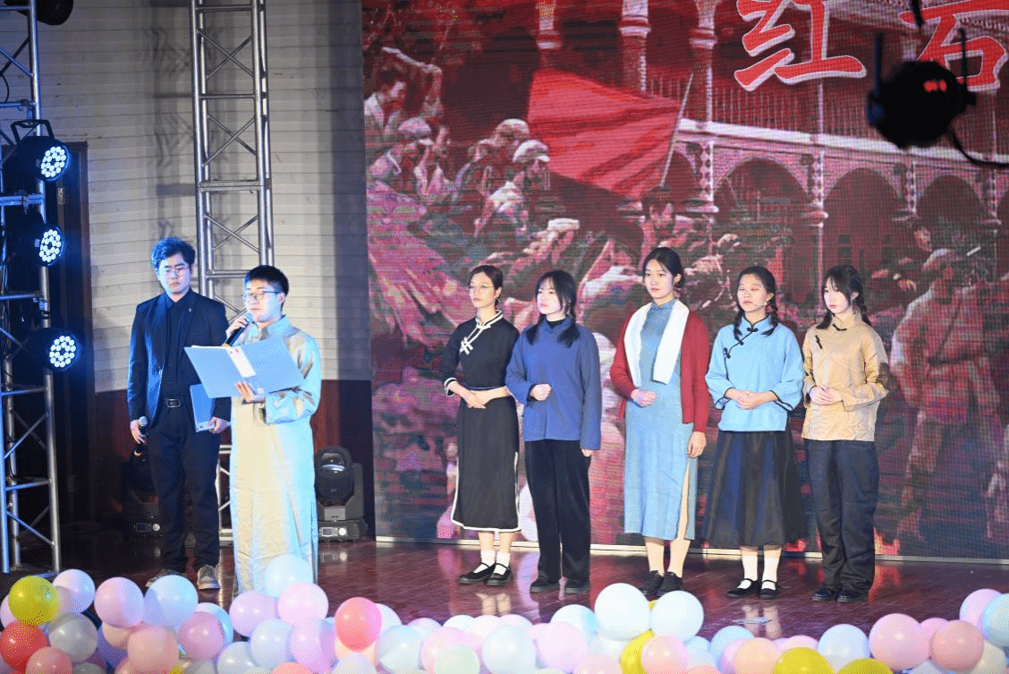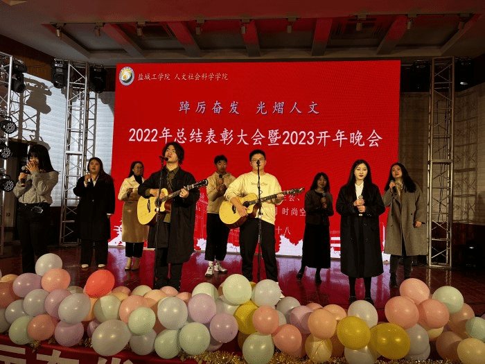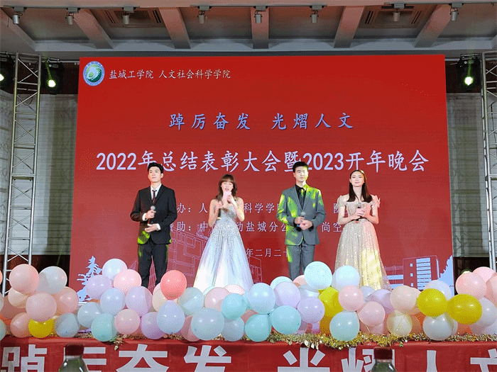 B旅游223夏沁同学带来热情洋溢的开场舞《burning》拉开了晚会的序幕。秋雨社同学们带来的正剧《红岩》引领观众回到了那个炮火连天、投身革命的峥嵘岁月。由王萍等同学带来的舞蹈《失恋阵线联盟》以欢快音乐与动作点燃了全场的气氛。刘嘉欣等同学用甜美的嗓音为我们带来合唱《心墙》。赵俊峰、邢豪、仲梓玮和凌韩玺同学带来的歌曲串烧《情非得已》、《忽然之间》、《乌梅子酱》、《你曾是少年》引起呼声阵阵。由吴群悦及其搭档带来的配音秀《学习的诱惑》洋洋盈耳,给台下的同学带来一场听觉盛宴。接着,小游戏《甄嬛传》台词接龙抢答引来同学们踊跃参与,全场气氛愉悦。欢乐的游戏时间结束后,宋倩倩同学带来了热情洋溢的舞蹈《solo》。女生合唱《决爱》深情动人,公司秋雨社带来的相声《诗词大会》更是让不少同学捧腹大笑。邓妍同学带来的舞蹈《潮生复水谣》引人入胜,让观众感受到了盐城湿地丹顶鹤的的优雅。刘瑞等同学带来的朗诵《青春献礼二十大》向我们展示了青年蓬勃的朝气与自信。专兼职辅导员代表和员工代表合唱《New Boy》将晚会推向高潮。最后,合唱《我爱你中国》表达了青年老员工乘着时代的春风,在以中国式现代化全面推进中华民族伟大复兴的新征程上续写新的华彩篇章的雄心壮志。