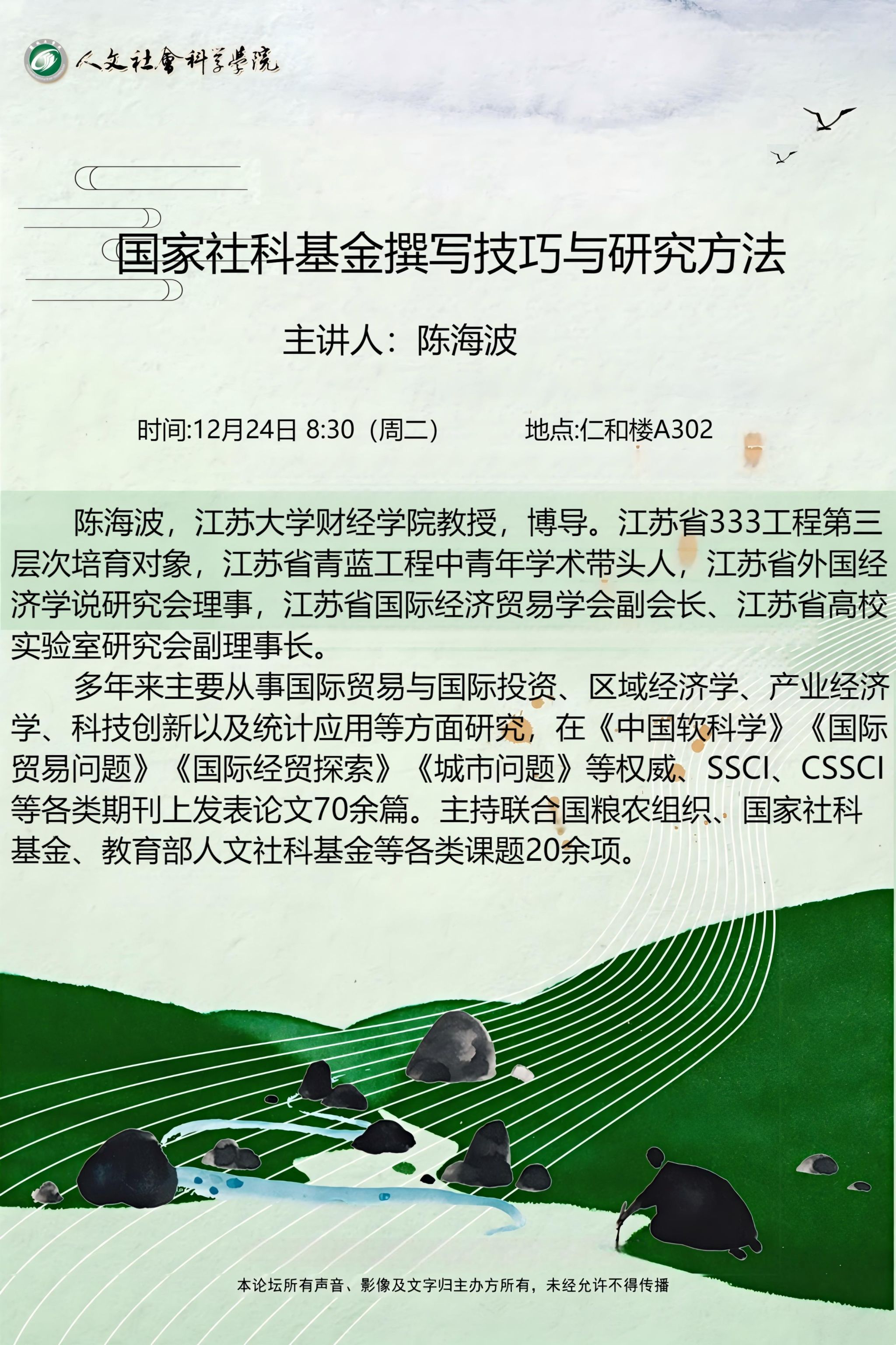 12月23日,l9193永利在仁和楼A302教室成功举办了一场关于国家社科基金撰写技巧与研究方法的专题讲座。此次讲座特邀江苏大学财经公司教授陈海波主讲,l9193永利经理周晓燕出席会议,副经理陶文俊主持会议。