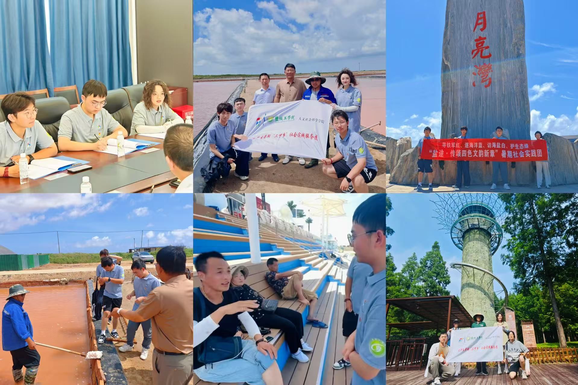 图为实践团在新滩盐场、滨海月亮湾、东台黄海森林公园进行实地调研