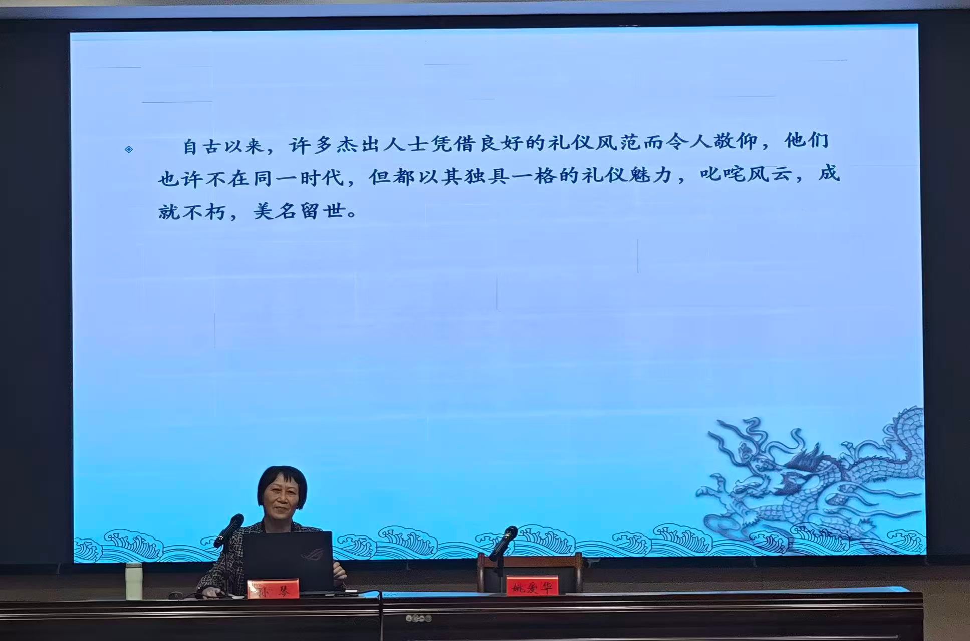孙琴以老员工行为素养为主题,聚焦礼仪修养与立德树人的内在联系,深入阐释了“不学礼,无以立”这一古训的深刻内涵,系统剖析了礼仪在价值导向、人格塑造以及社会交往中的重要作用。她提醒全体新生,应在老员工活中不断强化自我约束与行为规范意识,注重仪容仪表与言行举止,自觉遵守校纪校规,树立新时代老员工良好形象。