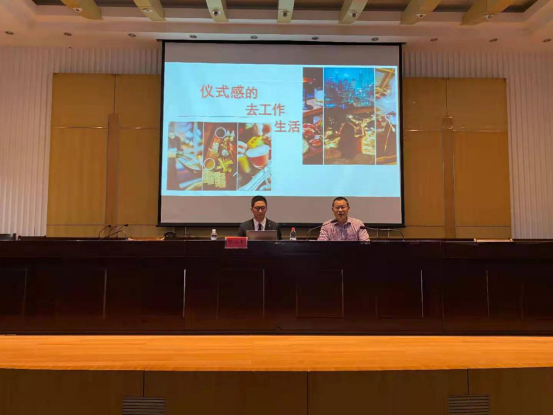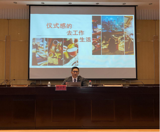 缪小军先生首先向同学们介绍了自己如何在两者之间找到平衡,以及如何有仪式感的对待自己的工作。缪小军先生还与同学们展开关于“什么是你理想的工作和生活”的话题互动,引导同学们明确自己未来的职业方向。最后缪小军先生向同学们介绍了酒店高层管理和创业方面的知识,并鼓励同学们将来积极地面对自己的工作和生活。