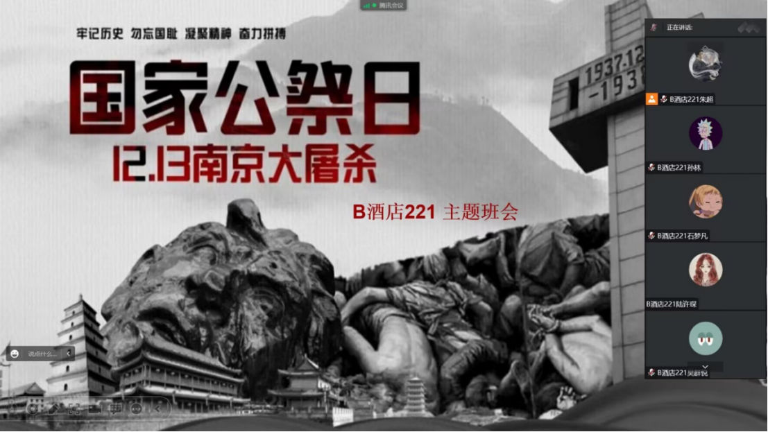 活动中,同学们观看了南京大屠杀死难者国家公祭仪式直播,怀着沉痛得心情向南京大屠杀遇难同胞默哀,缅怀为中国人民抗日战争胜利奉献出生命的革命先烈和民族英雄。之后,各班级召开“牢记历史 勿忘国耻”国家公祭日主题班会,班级员工干部通过PPT等向同学们讲述国家公祭日的由来,之后通过观看主题教育视频以及《南京!南京!》等电影让同学们更深入的了解震惊世界的"南京大屠杀"的惨痛历史和国家公祭日的由来。最后,所有的同学们在线参与“勿忘国耻、圆梦中华”国家公祭日大型网络联动公祭活动,通过线上为遇难同胞点烛、献花、敲响和平大钟、为和平祈愿等方式缅怀逝者、寄托哀思、守护和平。