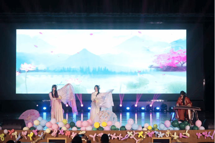 晚会在寻梦乐队带来的歌曲表演《崇拜》中缓缓揭开帷幕。紧接着,王艺菲等同学用饱满热情呈现的集体舞《像你这样的朋友》,脚步轻快、精神昂扬,尽显人文学子朝气蓬勃的青春风貌。麦尔丹和陈嘉怡两位同学以独特的嗓音和细腻的情感表达深情演绎歌曲《罗生门》。田阳等同学用现代幽默诙谐的表演方式,将古装剧经典片段《甄嬛传之滴血验亲》演绎得生动有趣,引得现场观众阵阵笑声。阿迪莱·阿卜杜外力等少数民族同学带来的舞蹈《雪莲花开》典雅优美,仿若一朵朵盛开的纯白雪莲。李羽夕等同学的三人合唱《想你时风起》婉转悠扬,吹起了大家心中的悸动与感怀。张羽嫣等同学演绎的配音秀《小时代之作业划水版》,结合现代热梗,幽默感十足。刘思睿、丁羿丹带来的街舞串烧和艾尚模特社的服装走秀《AI SHANG——Show》青春动感,魅力四射,点燃了全场观众的热情,将晚会推向高潮。邱子涵同学的古筝演奏与钟颖颖、许琰熙两位同学的古典舞相得益彰,将国风歌曲《红马》演绎得如诗如画,令人陶醉。秋雨话剧社以“五四运动”为背景,展演的红色话剧《破晓》,让观众仿佛置身于青年为了国家的尊严和民族的未来,振臂高呼、奋起抗争的觉醒年代。王紫郦等同学带来的原创诗歌朗诵《鹤舞鹿鸣·盐城绿林湿意浓》,用清澈的心灵之声,将盐城黄海湿地的自然美景、生态和谐与生物多样性的独特魅力娓娓道来。24级新生代表们通过《如愿》的歌声传递着青年员工对未来的无限憧憬与坚定信念。
