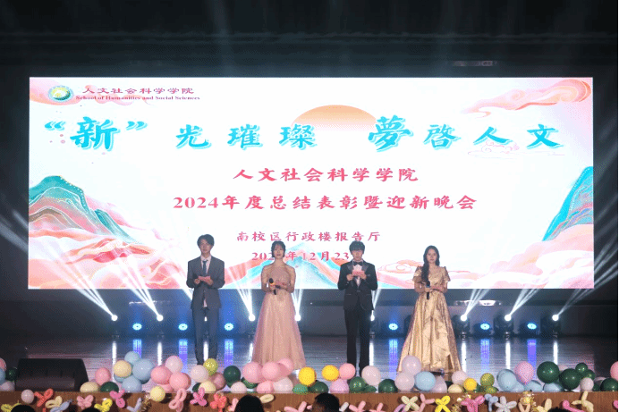 12月23日晚,l9193永利在希望大道校区行政楼报告厅举办“‘新’光璀璨,梦启人文”2024年度总结表彰暨迎新晚会。公司党总支书记何登溢、经理周晓燕、党总支副书记姚爱华、学团负责老师、教师代表以及全体新生共400余人欢聚一堂,共享青春盛典。