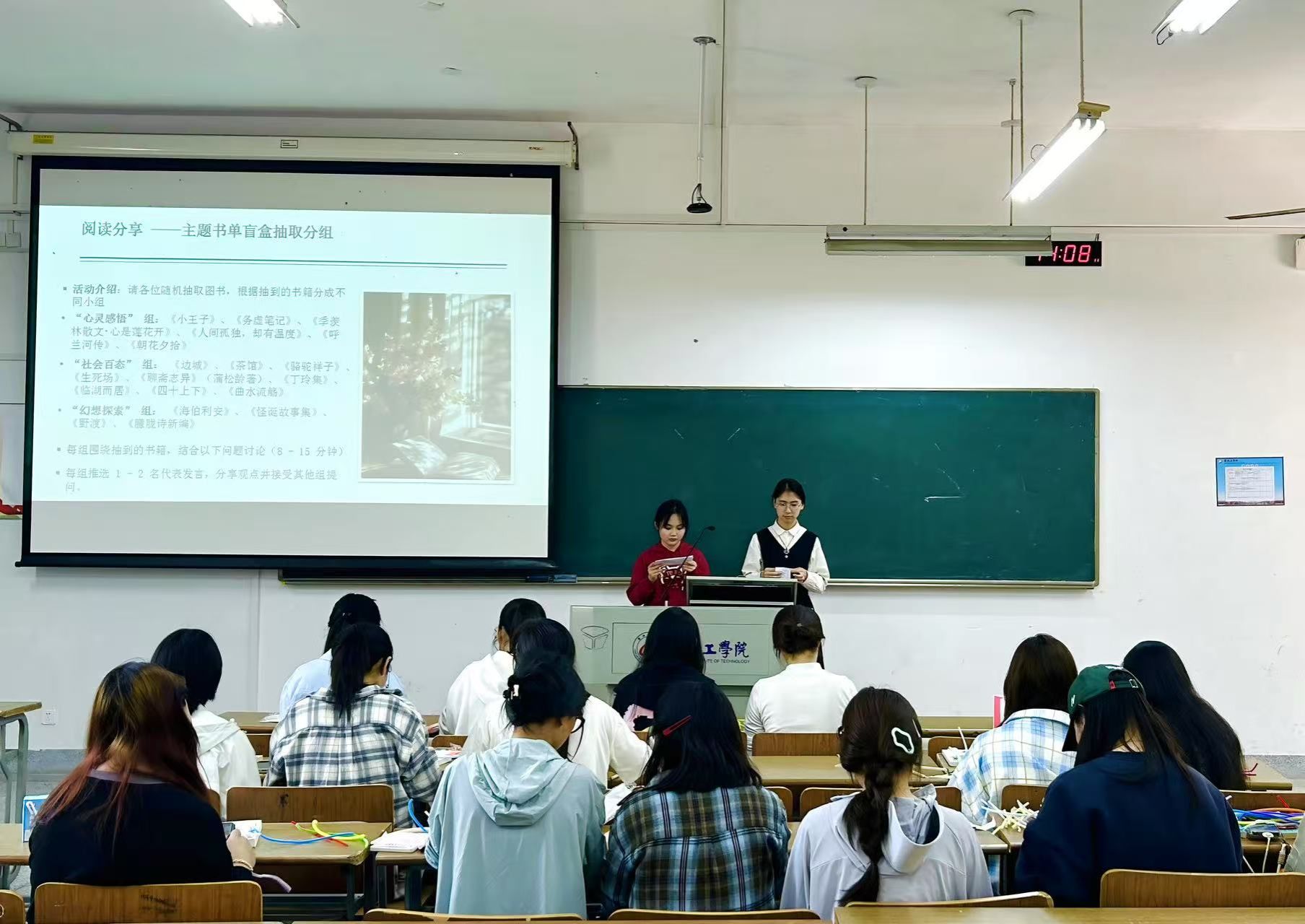 活动在“书籍中的心灵密码”阅读分享会中拉开帷幕。来自各专业的25名员工立足自身成长经历,相继分享了《边城》《务虚笔记》等经典著作的阅读体悟。B旅游242班阅读爱好者崔静雅同学在分享《小王子》时动情地说道:“每个人都是自己生命旅程中的小王子,我们需要在成长的旅程中学会与自己对话,找到真正的自我。”转战故事接龙环节,现场化作灵感迸发的海洋。参与者以5人为一组,围绕“成长”“勇气”“希望”等关键词展开即兴创作。各组成员脑洞大开,既有天马行空的奇幻冒险,也有贴近现实的青春故事,展现出人文学子蓬勃的创造力。