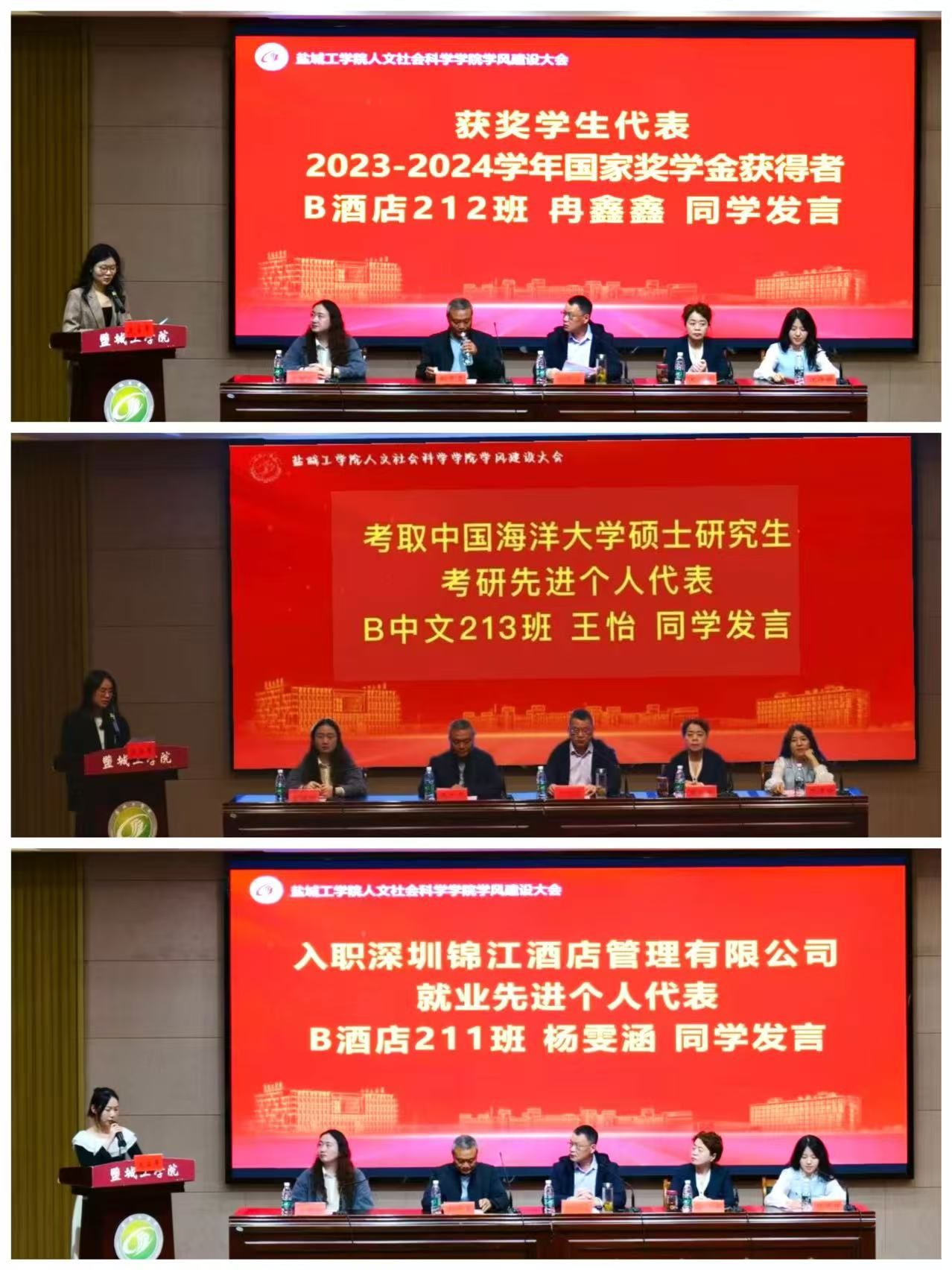 获奖员工代表、2023-2024学年国家奖学金获得者B酒店212班冉鑫鑫同学,考取中国海洋大学硕士研究生、考研先进个人代表B中文213班王怡同学,入职深圳锦江酒店管理有限公司、就业先进个人代表B酒店211班杨雯涵同学,依次上台发言。她们分别从学习、考研、就业等方面分享个人经验和心得,鼓励同学们要高擎理想火炬、锚定人生坐标,以笃行不辍的执着深耕梦想沃土,不负青春,不负韶华。