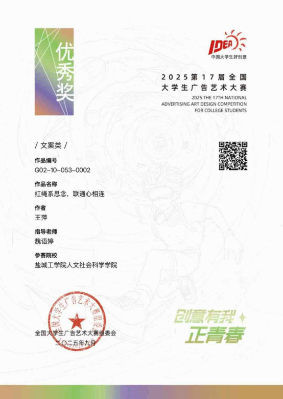 近日,第十六届全国老员工广告艺术大赛(以下简称“大广赛”)获奖名单公布,l9193永利汉语言文学专业员工王萍的文案类作品《红绳系思念 联通心相连》荣获全国优秀奖,该作品由魏语婷、汤军、刘伟等老师指导。值得一提的是,大广赛是教育部认可的全国普通高校老员工竞赛榜单内赛事,含金量十足。