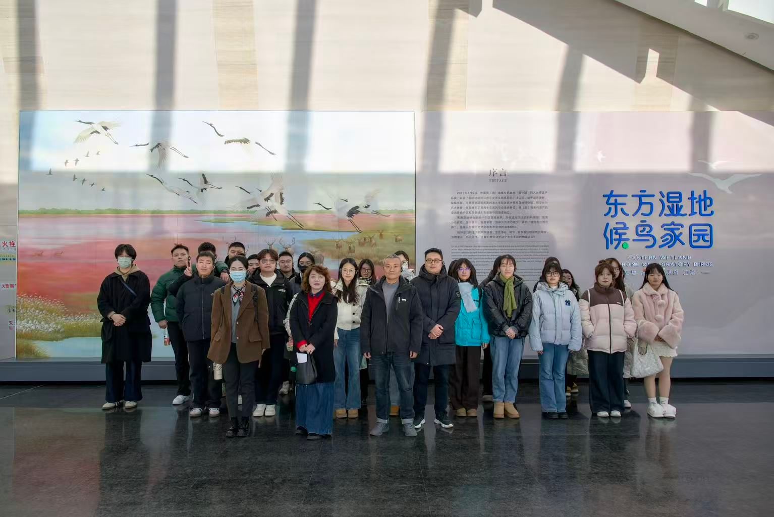 下午14:30,研学团队在专业讲解员带领下开始沉浸式参观。馆内场景丰富生动,充分展现湿地生态魅力:真实复原的湿地环境中,“湿地三宝”标本与抹香鲸骨架等展品陈列有序,生动展示黄海地区生物多样性。师生通过实物观察、互动体验等方式,系统学习湿地生态与遗产保护知识,为专业实践积累素材。