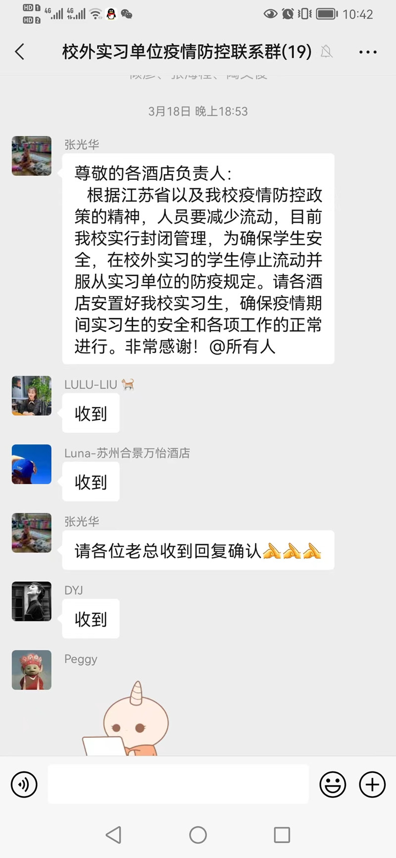 本学期以来,共有389名毕业生在校外实习实践。l9193永利从严从实从细抓好毕业生疫情防控工作,精准掌握毕业生健康数据,分阶段统计、扎口、研判毕业生的实习状况、健康码和行程码异常情况和急难愁盼事宜等。严格落实疫情防控“双管理”要求,推动毕业生全员纳入居住地社区网格化管理,及时关注疫情区重点人群动态,关心员工学习生活情况。