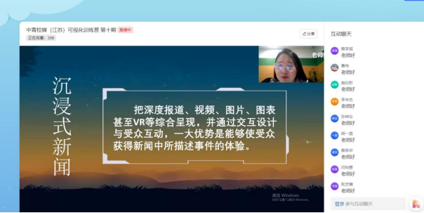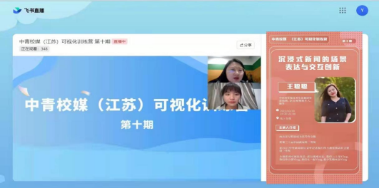 为提高公司中文系员工沟通与写作的能力,2022年3月30日晚,沟通与写作教研部组织同学们在飞书直播平台上观看由中国青年报社的编导王聪聪为主讲人的中青校媒(江苏)可视化训练营第十期的直播培训——《沉浸式新闻的场景表达与交互创新》。