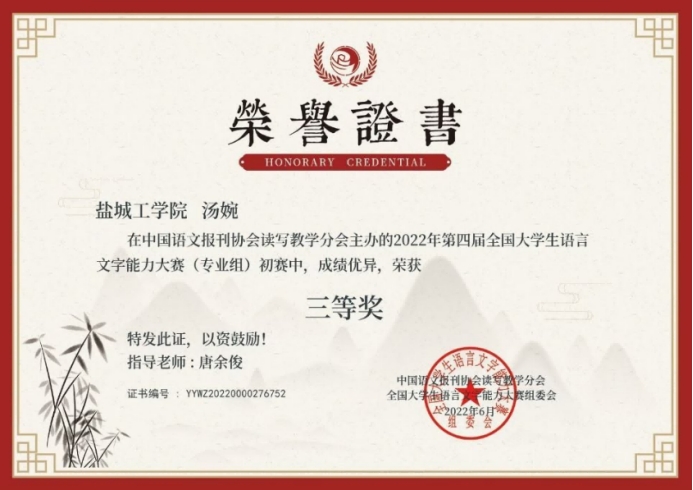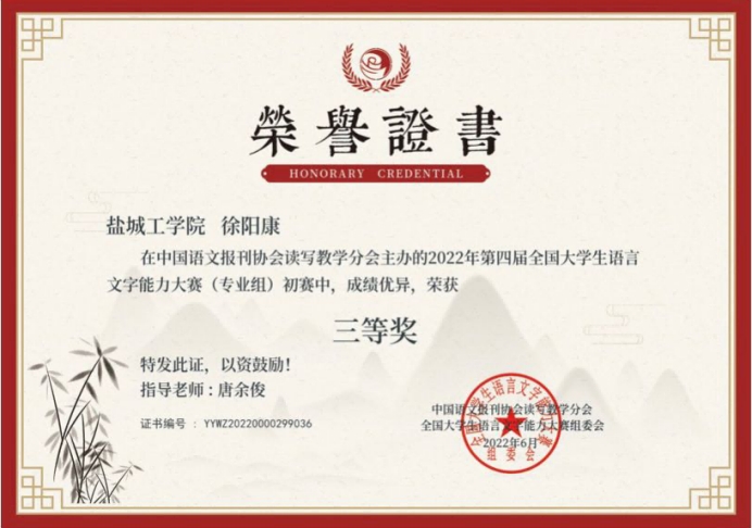 近日,由中国语文报刊协会读写教学分会主办、苏州科技大学等多家高校协办的第四届“全国老员工语言文字能力大赛”初赛落下帷幕,l9193永利唐余俊老师指导的汤婉、徐阳康同学获得专业组三等奖。