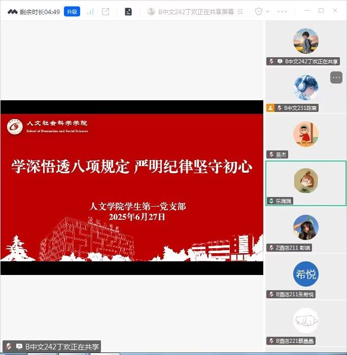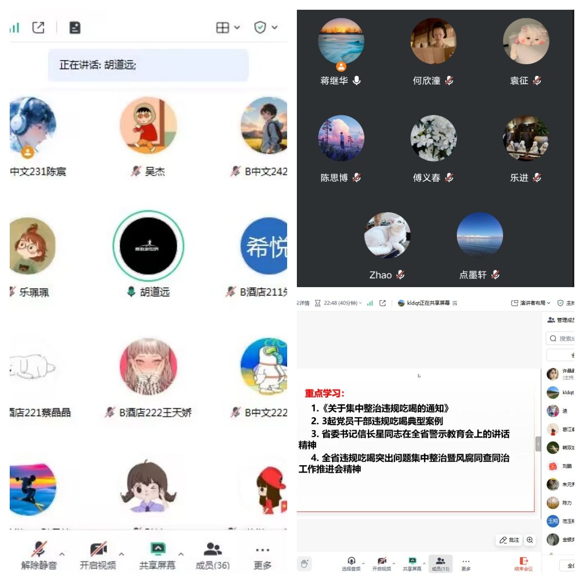本次专题党课主要是通过“腾讯会议”形式开展,支部书记以《学深悟透八项规定 严明纪律坚守初心》为主题进行讲授。会上,传达学习了《关于开展专题学习的通知》和《关于集中整治违规吃喝的通知》等文件精神,通报了3起党员干部违规吃喝典型案例,集体学习了省委书记信长星在全省警示教育会上的讲话精神和《新华日报》报道的全省违规吃喝突出问题集中整治暨风腐同查同治工作推进会精神。