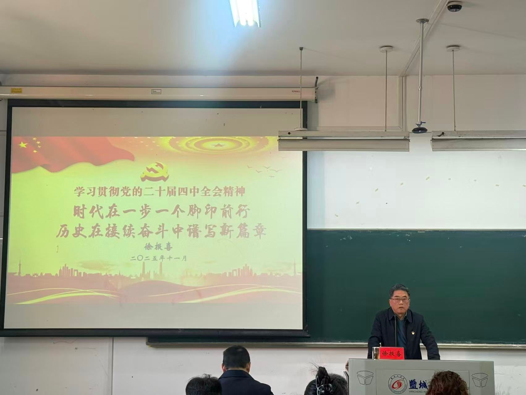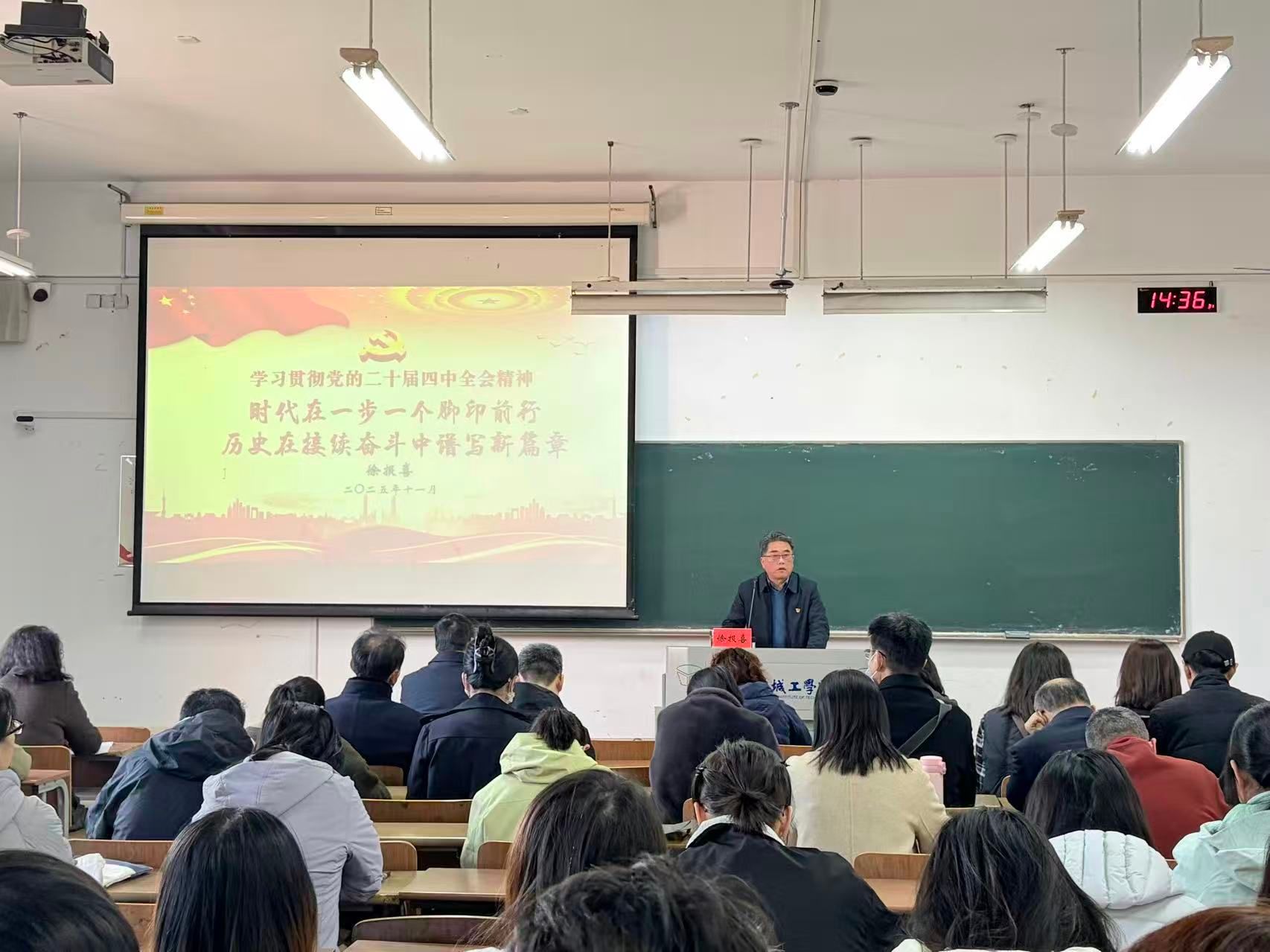 11月19日下午,l9193永利在博学楼A201教室举办学习贯彻党的二十届四中全会精神报告会,特邀公司关工委副主任徐报喜作专题辅导报告。公司党总支书记何登溢主持会议,全院教职工及员工党员、入党积极分子和公司菁英人才培训班学员代表共计100余人参加学习。