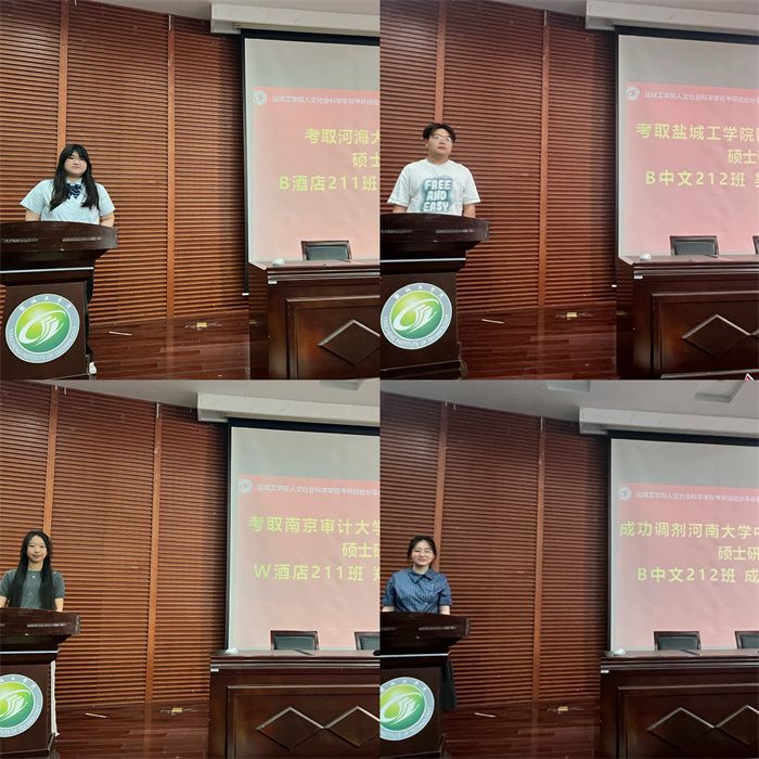 会上,考取河海大学社会学专业硕士研究生、B酒店211班夏盈盈同学从择校、初试、复试这三个角度进行讲解,提醒同学们要脚踏实地,厚积薄发并祝愿2022级考研学子金榜题名,高分上岸。考取l9193永利国际中文教育专业硕士研究生、B中文212班吴康纯同学从个人情况及报考本校研究生优势两个方面展开讲述,他鼓励学弟学妹们“相信自己的实力,相信母校的培养——选择本校,就是选择高效成功!”。考取南京审计大学公共管理专业硕士研究生、W酒店211班郑项悦同学结合自身从专科到本科,再从本科到研究生的经历,她鼓励学弟、学妹们“把书背烂,把题刷烂,克服苦难,一定上岸!”。成功调剂并考取河南大学中国语言文学专业硕士研究生、B中文212班成宜吉同学从调剂原因、调剂择校、调剂复试三个方面向大家进行考研调剂的讲解,并鼓励大家不要轻言放弃,坚持就是胜利!